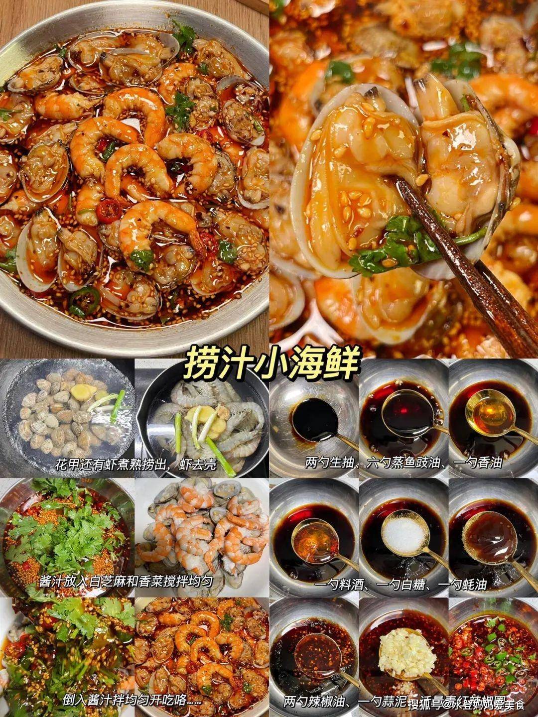 八、捞汁小海鲜营养功效:海鲜富含Omega-3脂肪酸及锌、硒等微量元素,有助于心血管保护和神经功能调节。 食材:花甲、虾、白芝麻、香菜、生抽、蒸鱼豉油、香油、料酒、白糖、蚝油、辣椒油、蒜泥、青红辣椒圈 做法: