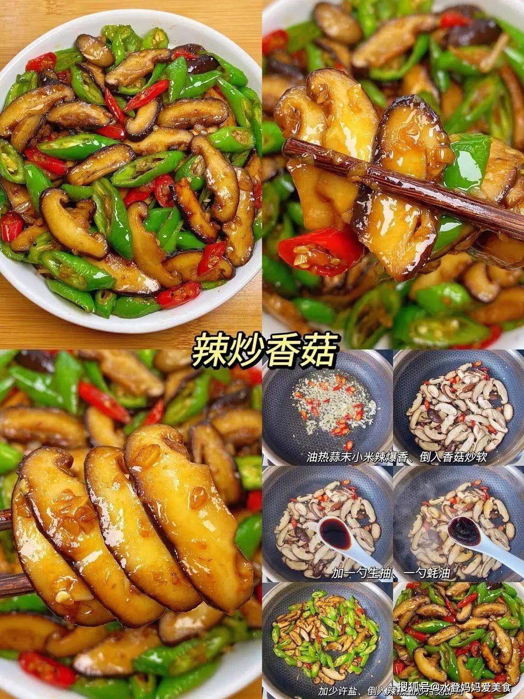 二、辣炒香菇营养功效:香菇含多糖类物质,可激活巨噬细胞活性,增强免疫力;膳食纤维改善消化功能,天然酶辅助分解蛋白质和脂肪,另有清除自由基、延缓衰老的作用 食材:香菇、青红椒、蒜末、小米辣、生抽、蚝油、盐 做法: