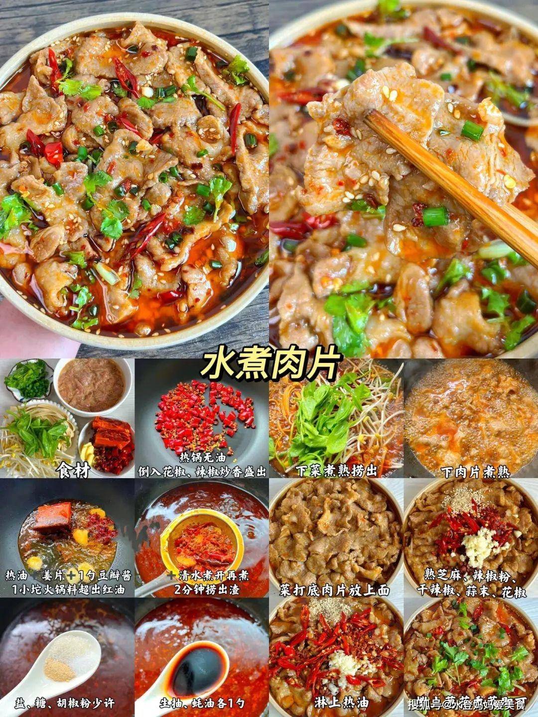 九、水煮肉片营养功效:猪肉提供血红素铁和蛋白质,预防贫血;豆芽含维生素C和植物酵素,促进营养吸收。 食材:肉片、花椒、辣椒、豆芽、青菜、姜片、豆瓣酱、火锅料、盐、糖、胡椒粉、生抽、蚝油、熟芝麻、干辣椒、蒜末、葱花、香菜 做法: