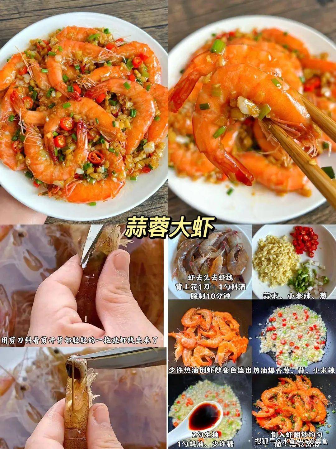 五、蒜蓉大虾营养功效:虾类富含优质蛋白及锌元素,促进伤口修复和免疫系统运作;大蒜素具有抗菌消炎作用。 食材:大虾、蒜末、小米辣、葱、料酒、生抽、蚝油、糖 做法: