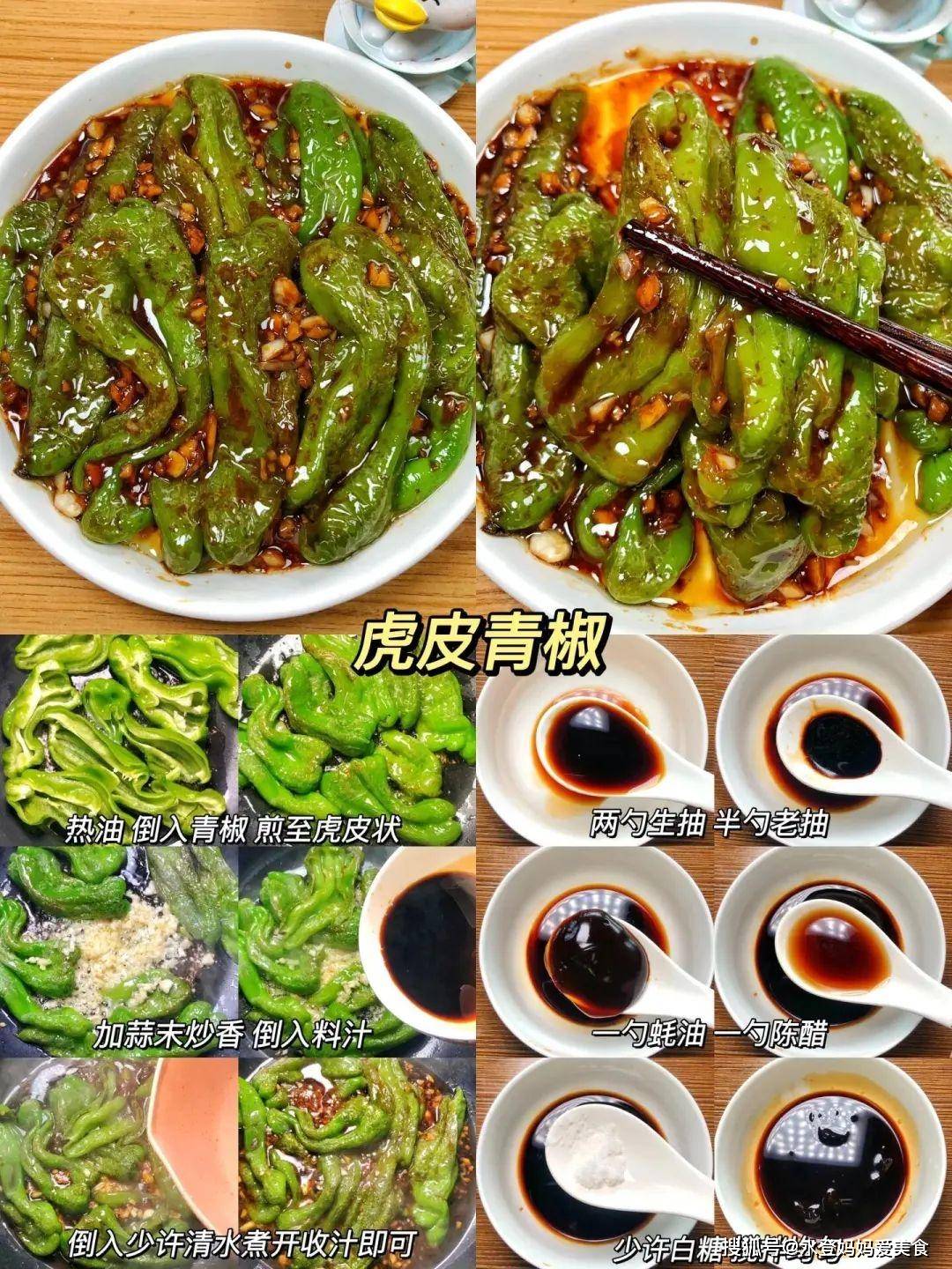 七、虎皮青椒营养功效:青椒维生素C含量极高(约144mg/100g),抗氧化能力强,可促进胶原蛋白合成和铁元素吸收。 食材:青椒、蒜末、生抽、老抽、蚝油、陈醋、白糖 做法: