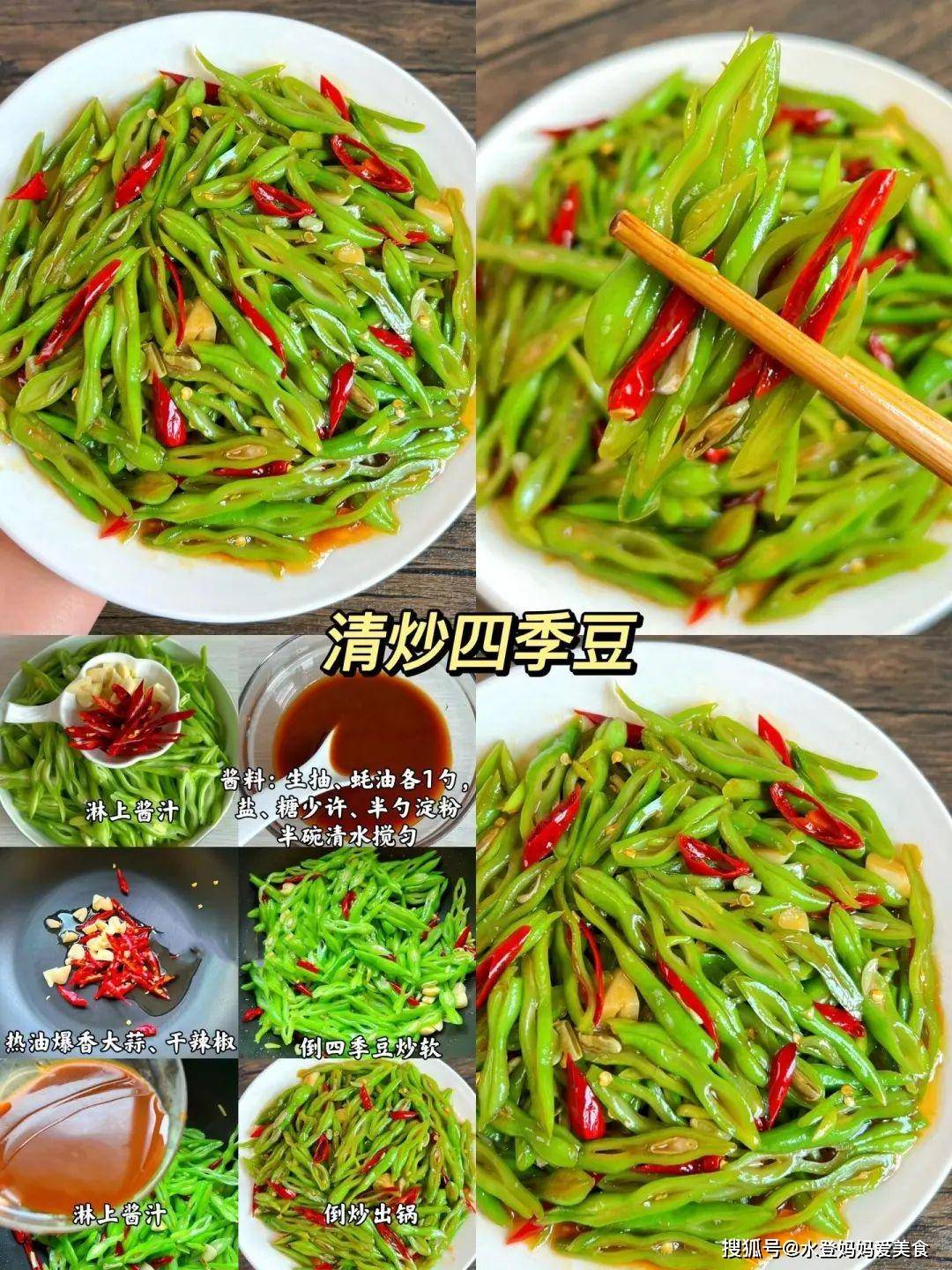 六、清炒四季豆营养功效:四季豆含皂苷类物质和膳食纤维,帮助调节胆固醇水平,改善代谢功能。 食材:四季豆、大蒜、干辣椒、生抽、蚝油、盐、糖、淀粉 做法: